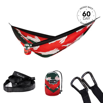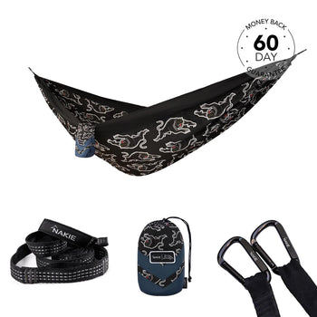 • Recycled Hammock, Straps, Tarp & Bug Net Combo - Nakie Studio shot featuring Nakie's hammock, bug net, and tarp combination, highlighting their durable and protective features for comfortable outdoor camping and backpacking