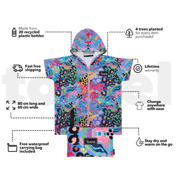 All of our Nakie beach towels come with a compact, water-resistant neoprene bag for easy storage. The Recycled Beach towel storage bag is 25cm × 20cm x 4cm. The XL storage bag is 24cm × 24cm x 9cm. The hooded towel storage bag is 22cm × 22cm x 8.5cm.