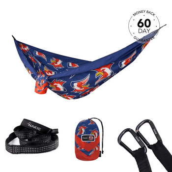 NRL Sydney Roosters x Nakie Double HammockDimensions: 3m × 1.8mWeight rating: 225kgWeight: 600g 2 × Hammock StrapsLength: 2.3m per strapWeight r...